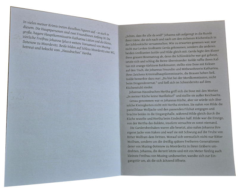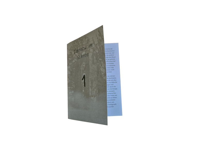 Die Faltblätter sind aus etwas dickerem Papier und einmal gefaltet. Vorn tragen die Blätter das Cover und eine Zahl von 1 bis 24, wobei sie in der richtige Reihenfolge geordnet sind. Innen finden Sie den Krimi. Auf der Rückseite werden einige Stationen des Caspar-David-Friedrich-Wegs in Greifswald vorgestellt.