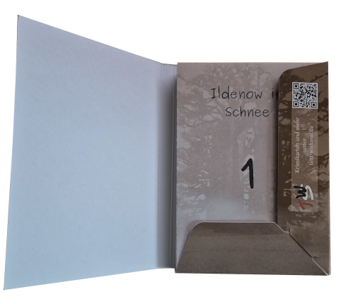 Die Faltblätter sind aus etwas dickerem Papier und einmal gefaltet. Vorn tragen die Blätter das Cover und eine Zahl von 1 bis 24, wobei sie in der richtige Reihenfolge geordnet sind. Innen finden Sie den Krimi. Auf der Rückseite werden einige Stationen des Caspar-David-Friedrich-Wegs in Greifswald vorgestellt.