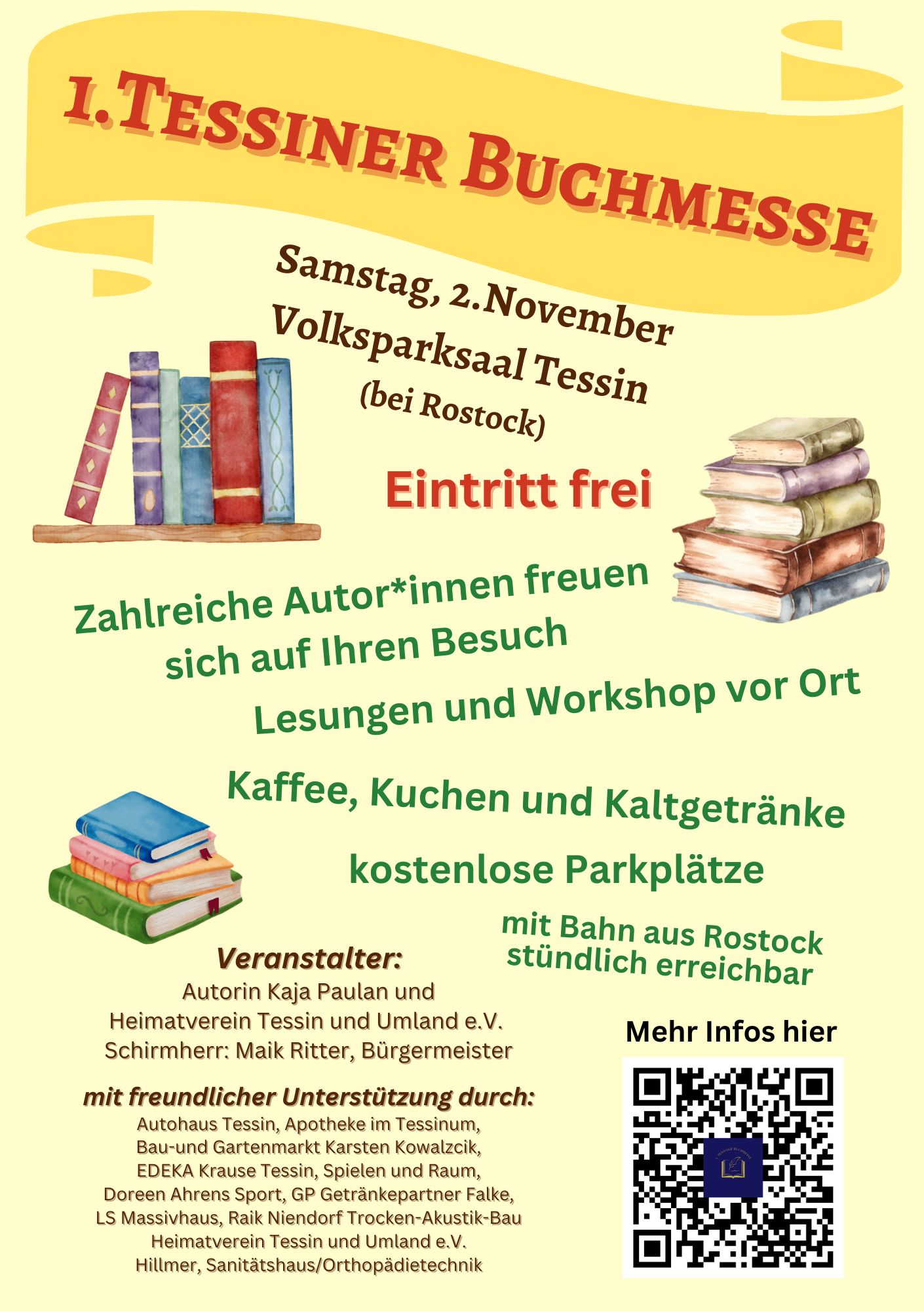 Buchmesse in Tessin am 8. November 2025 Im Volksparksaal in Tessin freuen sich am 8. November 2025 zahlreiche Autoren:innen auf neugierige Leser:innen! Die Veranstalter Kaja Paulan, der Förderverein der Freiwilligen Feuerwehr Tessin e.V. sowie der Bürgermeister Maik Ritter als Schirmherr erwarten Sie mit Kaffee, Kuchen und Kaltgetränken, die Autor:innen bieten Ihnen neben ihren Büchern auch Lesungen.