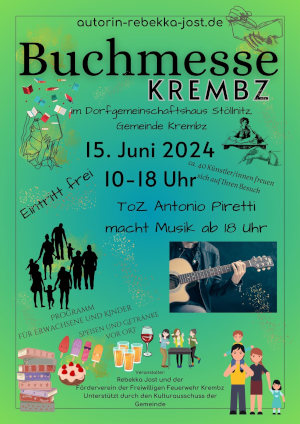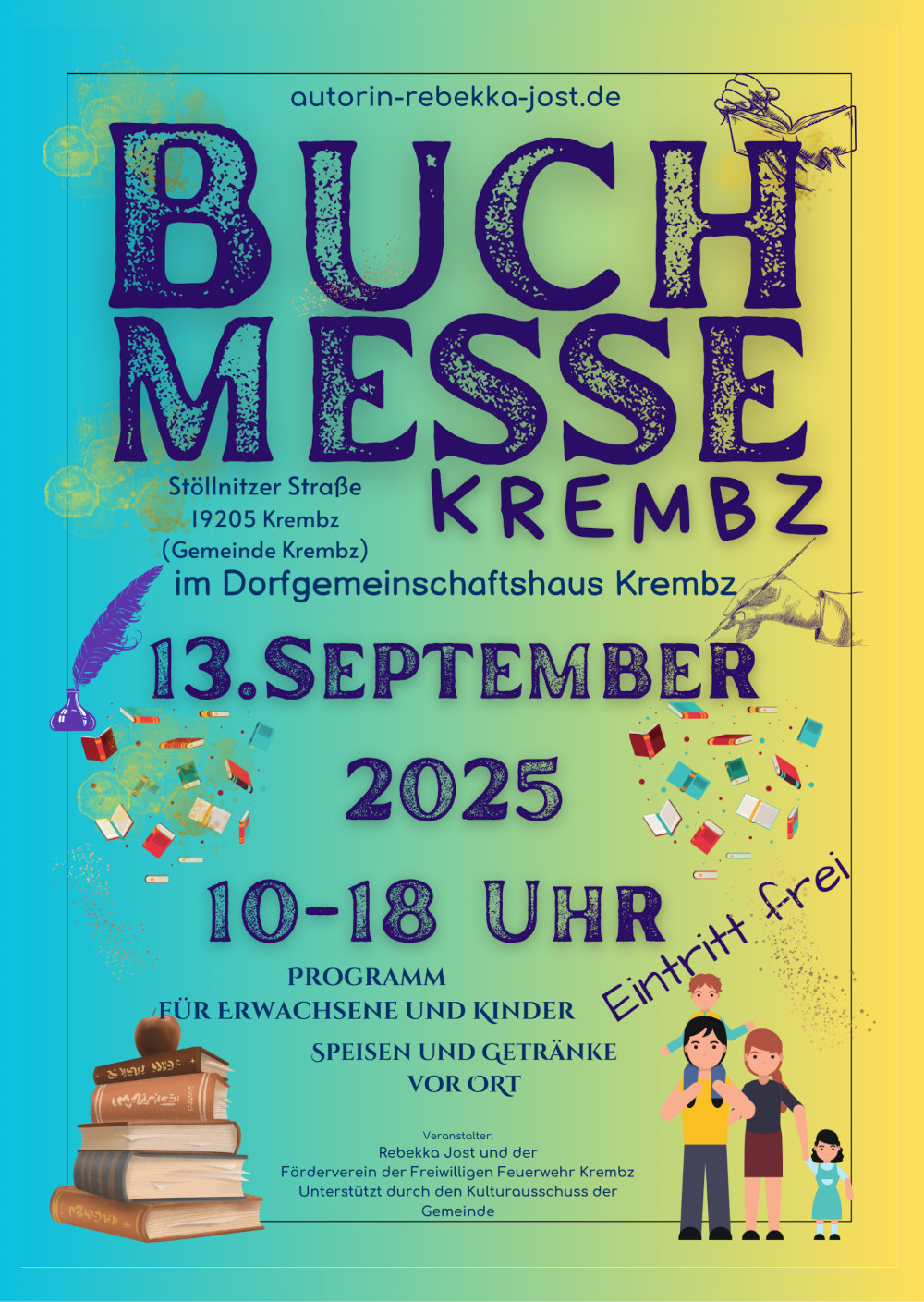 Buchmesse in Krembz am 13. September 2025 Rebekka Jost und der Förderverein der Freiwilligen Feuerwehr Krembz, unterstützt durch den Kulturausschuss der Gemeinde Krembz veranstalten am 13. September 2025, 10 –18 Uhr die Buchmesse Krembz, im Dorfgemeinschaftshaus, Stöllnitzer Straße, 19205 Krembz. Neben ca. 35 Autor:innen erwarten Sie ein buntes Programm für Erwachsene und Kinder und natürlich auch Speis und Trank.